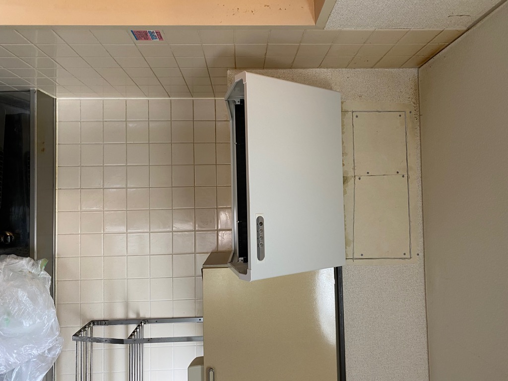 今回はあらかじめ取り外してる状態から取付けを行いレンジフードを取り付けた後クロス屋さんがクロスの張替えに来ます。
